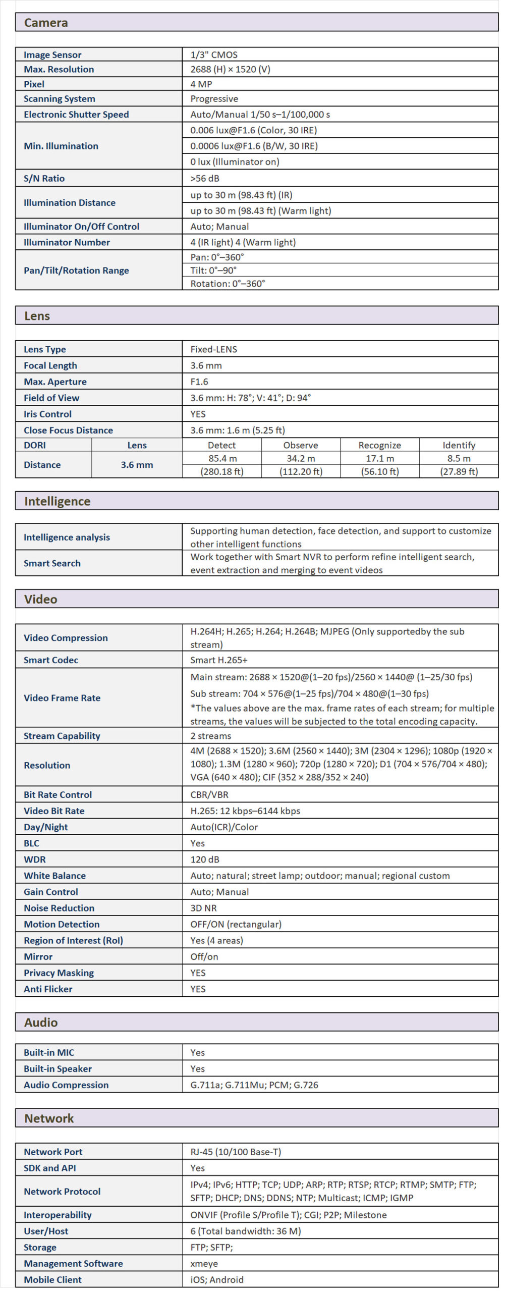 - Built-in warm light/IR LED, the Illumination distance is 30 m and the max. warm light distance is 30 m.